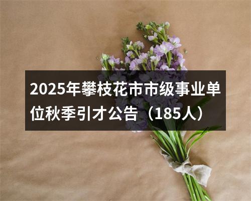 根据《中共中央组织部 人力资源社会保障部关于进一步做好事业单位公开招聘工作的通知》(人社部发〔2024〕57号)、《四川省人力资源和社会保障厅 中共四川省委组织部 中共四川省委机构编制委员会办公室关于印发〈四川省事业单位公开招聘工作人员实施办法〉的通知》(川人社规〔2024〕3号)等相关文件要求,按照“公开、平等、竞争、择优”的原则,经批准,我市部分事业单位拟面向社会引才185名。现将有关事项公告如下(本公告在攀西人才网www.pxrc.com.cn发布)。