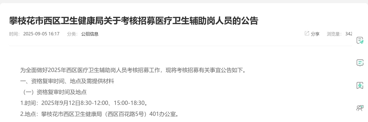 原标题:攀枝花市西区卫生健康局关于考核招募医疗卫生辅助岗人员的公告