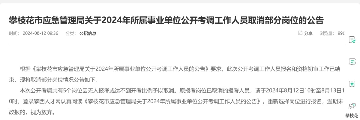 原标题:攀枝花市应急管理局关于2024年所属事业单位公开考调工作人员取消部分岗位的公告