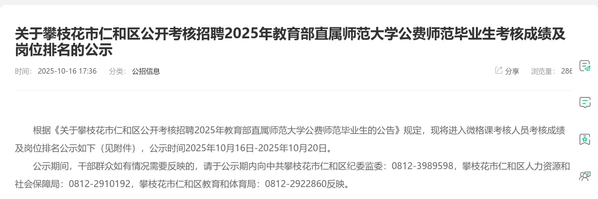 在线咨询 根据《关于攀枝花市仁和区公开考核招聘2025年教育部直属师范大学公费师范毕业生的公告》规定,现将进入微格课考核人员考核成绩及岗位排名公示如下(见附件),公示时间2025年10月16日-2025年10月20日。