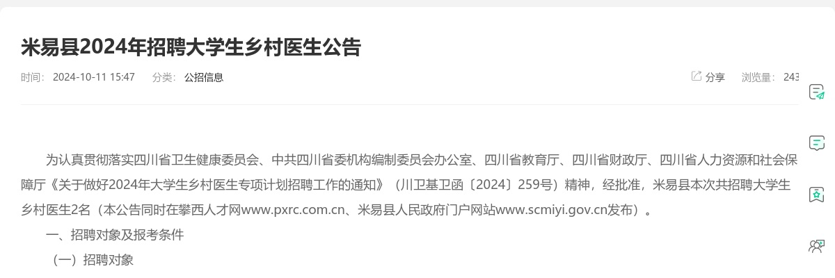 为认真贯彻落实四川省卫生健康委员会、中共四川省委机构编制委员会办公室、四川省教育厅、四川省财政厅、四川省人力资源和社会保障厅《关于做好2024年大学生乡村医生专项计划招聘工作的通知》(川卫基卫函〔2024〕259号)精神,经批准,米易县本次共招聘大学生乡村医生2名(本公告同时在攀西人才网www.pxrc.com.cn、米易县人民政府门户网站www.scmiyi.gov.cn发布)。